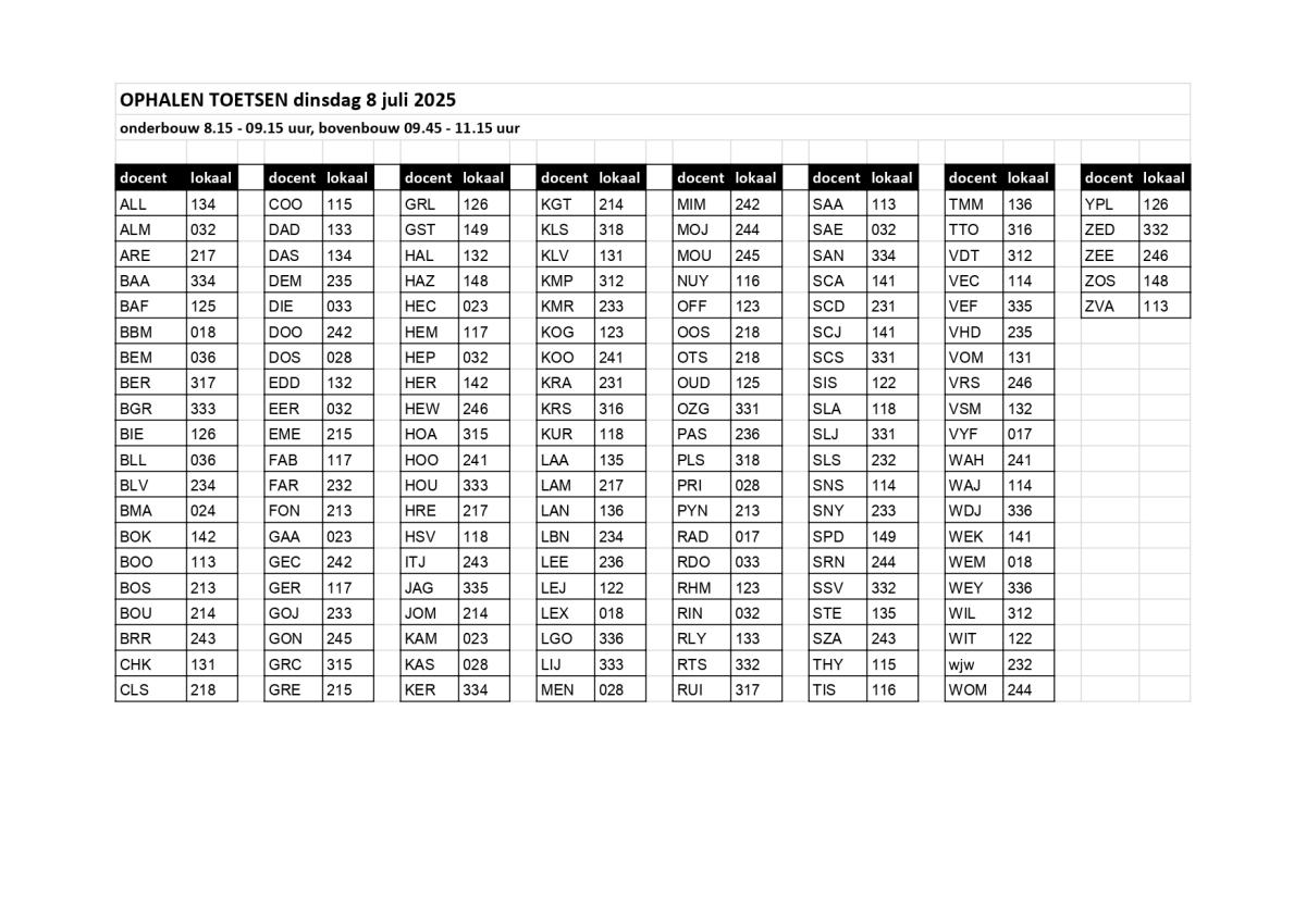 7 juli 2025Op dinsdag 8 juli kunnen alle havo- & vwo-leerlingen hun toetsen ophalen van de afgelopen toetsweek. Bekijk het schema om te zien in welk lokaal welke docent zit!